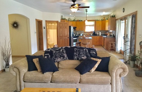 Depending on what time of year you are staying at the house; there are nesting birds (we have a returning mourning dove on the deck). We have seen pileated wood peckers fledge from the old tree by the river along the path to the best place to launch your kayak/canoe. That “old tree” looks dead, but is full of life and home to many of our woodland neighbors. It is not unusual to see a Bald Eagle, Osprey or other bird perched on top waiting to fish the river. Deer and the occassional Elk like to pass thru the expansive back yard as well.