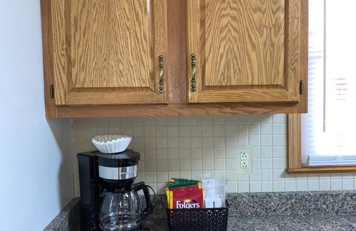 Dishes, pots, pans, baking sheets, toaster, bowls and coffee maker with regular and decaf coffee, sugar and creamer. Cleaning supplies, rags, paper towels, dish washer soap would also be found.