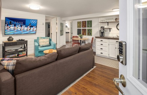 The unit sleeps 4 comfortably and has everything you need in the kitchen to dine in during your stay. The living room has a queen size sofa sleeper with bedding stored inside and a 55-inch smart TV. The bedroom has a queen size bed and a second smart TV that is 49”. Have little ones traveling with you? No problem, we offer a pack n play for them to sleep as well. The apartment also comes with a fully stocked kitchen including coffee in the morning