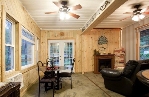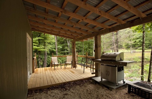 This unique property was constructed from two forty-foot, high-cube CONEX shipping containers. Yet, it feels like a cozy log cabin. It features a warm pine interior, gas fireplace, large picture windows that open into the woods, and french doors that open onto a private deck with gas barbecue. Descend the stairs from the covered deck and follow the trail along Miller's Creek to our epic water fall. You will find a bench at the top of the falls for quiet meditation and a trail that leads below and behind the falls.