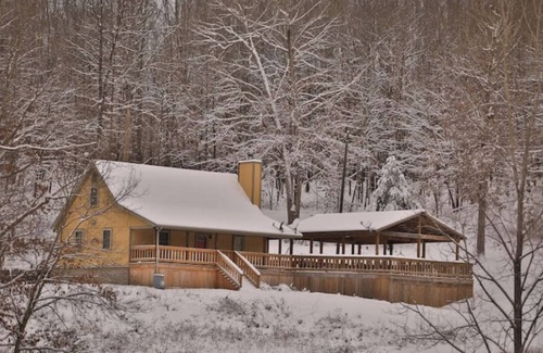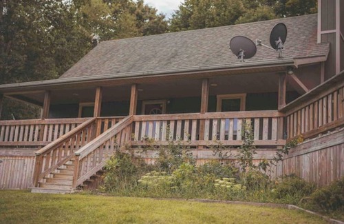 Enjoy a large 24'x32' covered porch overlooking your own private 5-acre lake, and 78 acres of land with 2.5 miles of scenic woodland trails. The 3-bedroom cabin boasts a large kitchen that is fully-stocked with everything you need to host large dinners. There's also a great space for an outdoor wedding, and parking for 60 cars. Guests typically want to stay at least 3 full days minimum to explore it all.