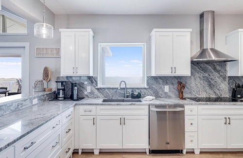 The dining area, which comfortably seats up to 24, is positioned to take full advantage of the stunning views outside. The large gourmet kitchen features sleek granite countertops, stainless steel appliances, and a large breakfast bar perfect for entertaining. The large kitchen is fully equipped and designed for hosting large gatherings. The spacious layout makes it ideal for preparing meals to be enjoyed with family and friends.