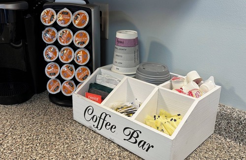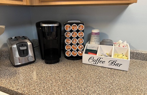 Fully Stocked Kitchen Our generously equipped kitchen is ready for you! Start your mornings at the fully stocked coffee bar, complete with “to go” cups for those busy days of exploration. Offering a full-size refrigerator, stove, dishwasher, microwave, toaster, and stackable washer & dryer, this kitchen ensures convenience and comfort.