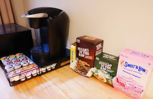 Living area with pullout couch, lift top coffee table, 55' Roku streaming TV, dining table, and kitchenette with microwave, Keurig coffee maker, coffee and sweetener assortment, and mini fridge.