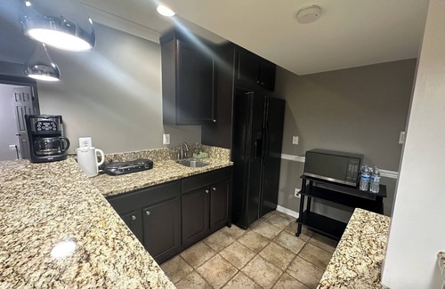 - Kitchenette (wet bar) with full-size refrigerator, double burner electric stove, microwave, hot water kettle, and coffee maker)