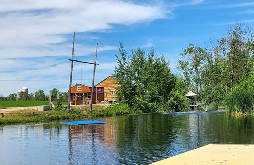 Man made pond about a 1/2 acres with fish and sandy beach for swimming. A swing and docks for going into the water. Paddle boad, kayaks and floating mats for swimming in the pond.
