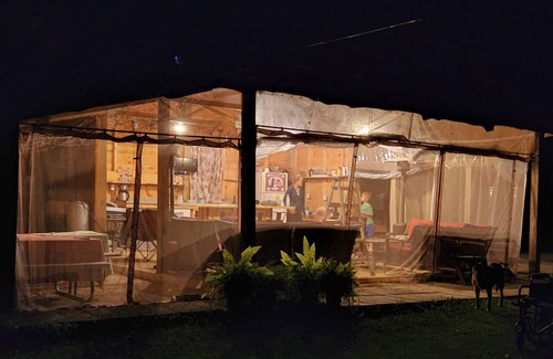 2 - 14 x 20 cabins with 2 lofts each and a queen bed on the main floor, each cabin can sleep 6 comfortably. Cabins have a TV with wifi and countertop/ cupboards and a corner table.