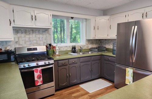 Fully equipped kitchen with refrigerator, stove & microwave. We've added AC for the 2025 summer season, but you'll probably find you wont need it.