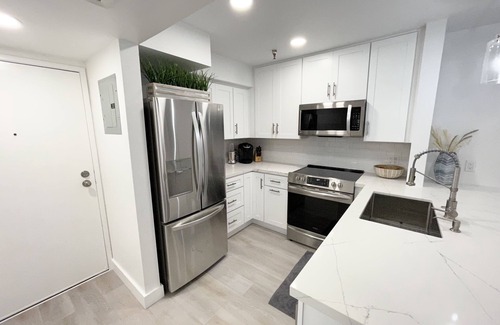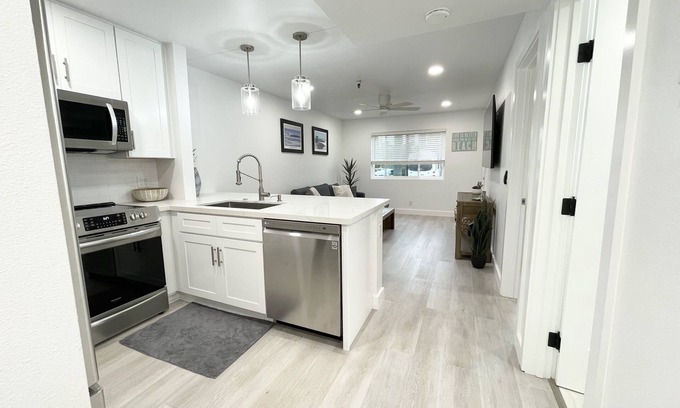 The completely remodeled kitchen is beautifully updated with quartz counters, new shaker cabinets, new refrigerator, electric range, microwave and dishwasher. The kitchen comes fully equipped - Keurig, hot water kettle, Ninja Blender, pots, pans, drinking and wine glasses, bowls, plate, complete knife set, and baking set. The bathroom is immaculate with a new vanity, sink, toilet, full tub with glass door. The living area and bedroom has new water-resistant laminate flooring. The living room contains a Samsung 65” smart TV and sofa that pulls out into a full bed. The master bedroom closet contains a full-size new washer and dryer.