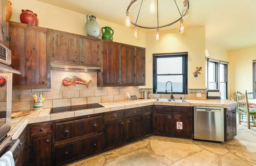 Step inside the main level and take in the light-filled interior, where a wall of windows frames breathtaking Gulf views. The living room invites you to relax in the large sectional for movie nights or quiet conversations. The fully equipped kitchen features stainless steel appliances, abundant counter and cabinet space, and stunning water views that make meal prep a breeze. Adjacent to the kitchen, two dining tables comfortably seat up to 15 guests, with an additional buffet serving area and deck access that makes indoor-outdoor entertaining effortless.