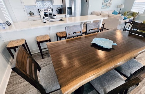 The fully stocked kitchen features stainless steel appliances, an oversized island, and plenty of counter space — perfect for prepping fresh-caught fish or family-style meals. Enjoy your meals at the large dining table, at the island’s barstools, or outside on the covered beachfront deck for true dine-with-a-view moments.