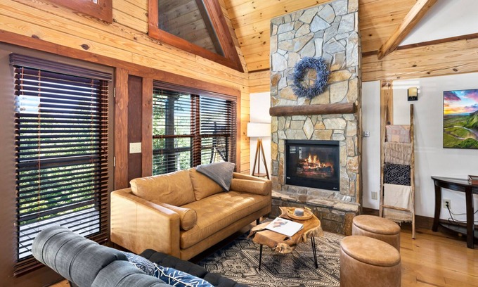 Enjoy wooded and mountain views of the Appalachians from the wrap-around deck in this mountain-modern, comfortable, cozy cabin. Located just south of Blowing Rock in the extremely private, gated community of Timber Rock, Mountain View Retreat features a hot tub, outdoor fire pit, and game room. The king master suite on the main level features deck access, a TV, and a private bathroom with a luxury step-in shower. Upstairs are two queen bedrooms and a full bathroom with a cozy loft lounging area. The lower level includes a king bedroom, a queen bedroom, an additional room with two twin beds, and a spacious game room with a pool table, TV, and comfortable stools.