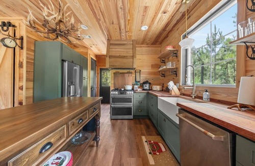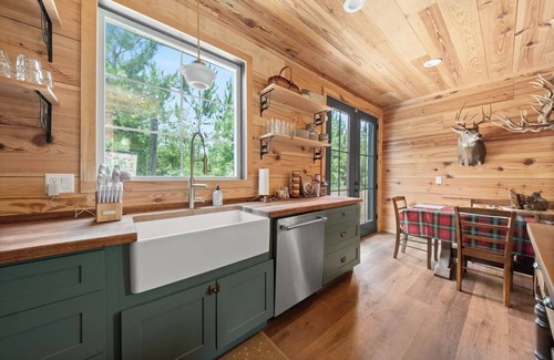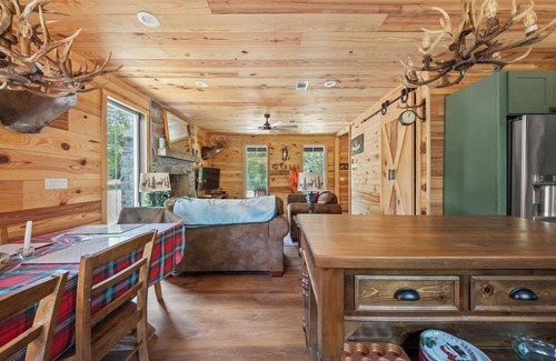 This cabin is on a very private 20 acre wooded property. The interior walls downstairs are milled from local Georgia pine and you'll love the smell as soon as you walk in! There is a wood burning fireplace w/ a gas logstarter to make fires easy! Downstairs in the kitchen you will find all of the amenities needed for cooking. Upstairs, there are 3 bedrooms and 2 full baths.