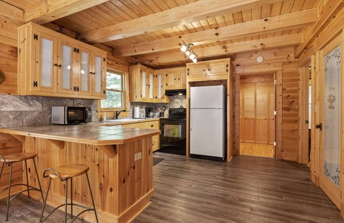 Additionally, Cabin in the Pines has a large open main living area that connects the kitchen, dining area, and living room on the first floor. There is one bedroom and one bathroom on the first floor. On the second floor you will find and open loft area with additional sleeping and entertainment options including a kids corner with crafting and games. The second floor has a master bedroom with a bathroom.