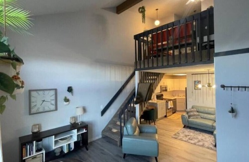 This unit boasts beautiful mid-century modern finishes in a fully functional 2 bed 2 bath layout. The upstairs bedroom offers a firm queen bed with its` own bathroom and mountain views. Expect an adjustable rainfall showerhead in a large walk-in shower. Upstairs has a private loft featuring its own TV, mini fridge and seating area while overlooking the open layout below. The unit captures bright natural light in the giant window in front, as well as the skylight from the open vaulted ceilings. The main level offers a quaint dine-in table for morning coffee that flows into the living room where you will find an adjustable TV, electric fireplace and cute desk for all your "hang out" needs. The galley kitchen is equipped with all the basics and leads into the master suite featuring a soft bed, its own walk-out porch and attached bathroom. The bathroom features a tub and adjustable/ detachable showerhead. Both rooms are equipped with laundry baskets, hangers, towels and extra linens.
