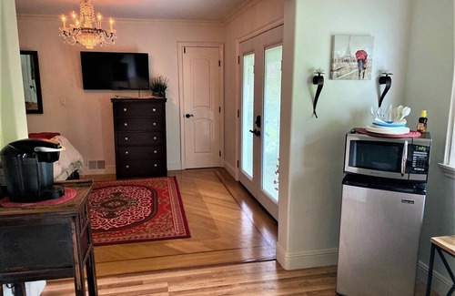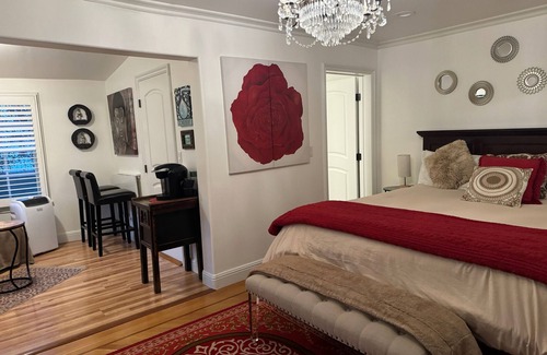 You'll enter your luxurious separate guest cottage through French Doors to a first floor inviting living space with a pillow-top California King bed, a separate sitting room with sleeper sofa, private full bathroom and a 43" UHD Roku TV.