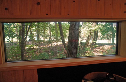 The interior makes extensive use of wood and features a METOS KAMIN woodburning stove