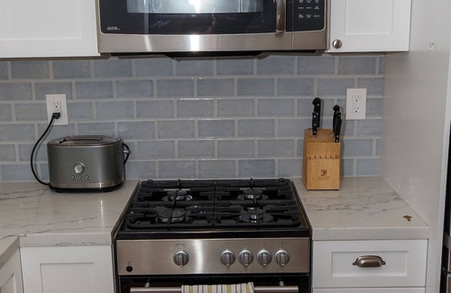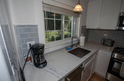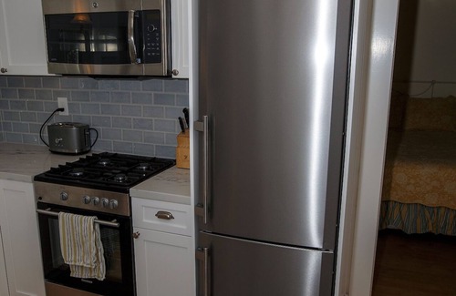 Charming, newly renovated garden cottage with separate entrance, private bathroom, and gourmet chef's kitchen. It is completely furnished with a plush king-sized bed, desk, desk chair, two end tables, luxury linens, armoire, custom closet, linens, ceiling fan, central heating, and air conditioning, and Hulu cable television with Netflix. The living room has a 50” television and the bedroom features a 43” television. The separate kitchen/living area includes a full-sized refrigerator, four-burner range, dishwasher, over the range microwave with convection oven, quartz countertops, and a washer/dryer. Additional small appliances and amenities include cookware, microwave, toaster, coffee maker, electric tea kettle, kitchen table with two chairs, and a rug. Dishes, cups, cutlery, and coffee filters are provided. Guests have exclusive use of the private patio behind the cottage, but do not have access to the main patio (owner's usage only).