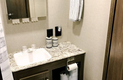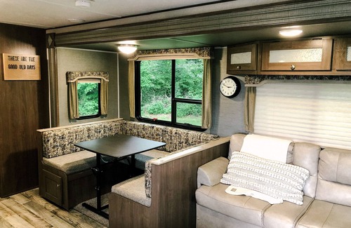 Our camper offers a full size queen bed and a bunk room with three twin beds and a small table for playing games. We have blackout curtains in the bedrooms for sleeping in! The bathroom is a typical camper bathroom - very small - but very functional and clean. All linens and towels and provided.