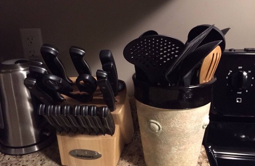 You have a private, separate entrance, which backs onto a large property, you can hear birds chirping from the private patio or from screened windows. The kitchen includes full appliances, granite countertops, large chef's sink, where you can prepare meals or snacks. Kitchen appliances and tools include a coffee maker, French press, kettle, toaster, blender, microwave, rice cooker, full stove & oven, chef tools, cooking knives, cutting boards, fridge, dishwasher, and prepping & cooking utensils. The kitchen is modern, with a chef's sink, rinse hose/sprayer, dishwasher and dish rack.