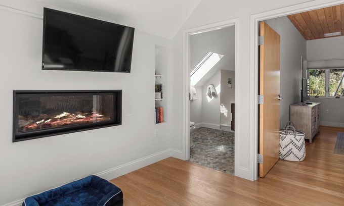 Step inside and be greeted by the warmth of freshly updated interiors, where every detail has been thoughtfully curated for your relaxation and convenience. The barn’s new finishes and appliances provide a contemporary touch, while the open layout ensures you feel connected to the beauty of the surrounding landscape. Inside, the remote-controlled indoor gas fireplace sets a cozy atmosphere for unwinding with a good book or a glass of wine.