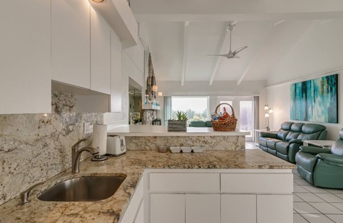 All tile floors andceiling fans in every room. The ocean view master bedroom has its own marble & granite bath. Awaken to ocean view from bed. House is very well-furnished, equipped and clean. Great room has a 18-foot high clerestory. This is a private ocean front home.