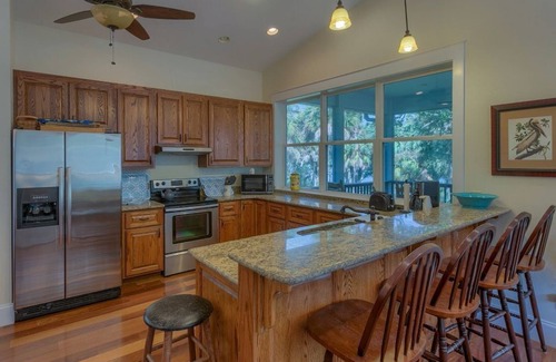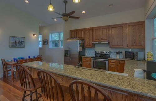 Floor Plan: Ground Floor - Outside - open parking area, outdoor shower, lagoon dock with fish cleaning station, covered seating, and kayak/paddle board launch. Inside - Great-room with living area, TV, DVD, sleeper sofa, kitchen, eat-in bar, dining, and access to the screen porch. Screen Porch - dining, seating, fans, lagoon view; Bedroom 1 - queen bed, TV, private full bath with tub/shower Jacuzzi; Bedroom 2 - queen bed, TV; Bath 2 - full bath with walk-in shower (handicap friendly).