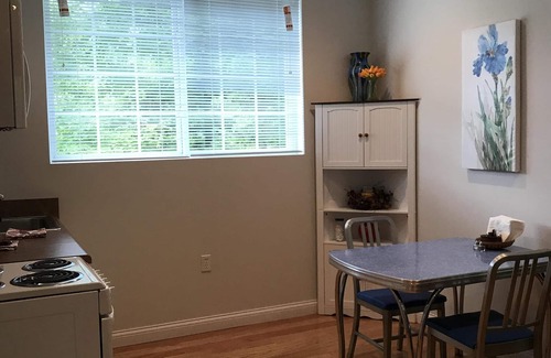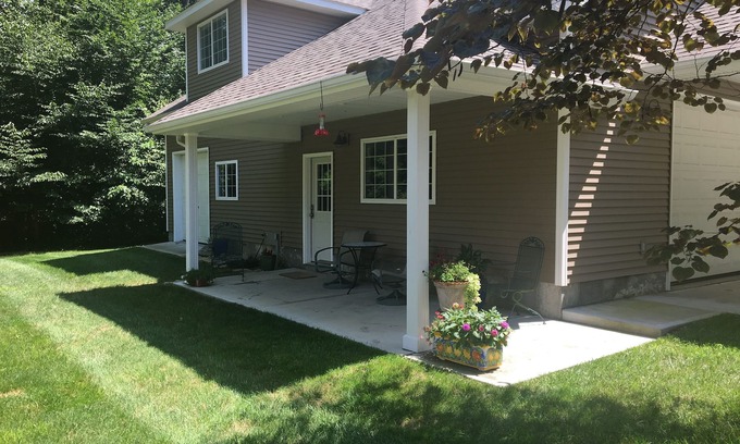 The properties paved private drive leads to a large paved off-street parking area behind the main home and adjacent to the building. The apartment shares an acre treed-lot with the home owner and allows for views into the tress and during the spring and summer a view of the flower gardens. In the evenings, listen to and watch the local birds until sundown when the birds nest and the environment becomes very quiet until sun-up. Likewise, there is no urban or rural light pollution and stars are often visible after dark. Late fall through winter views include a nearby lake and adjacent agricultural fields that are frequented by native wildlife including deer, turkey, hawks, and coyotes.