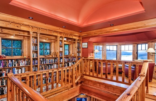 The main lodge is hand crafted from rare heartwood pine and stone. The interior design combines intimate inglenooks and dramatic public spaces. Exquisite arts and crafts cabinetry graces every corner of the structure. Each of the seven bedrooms is imaginatively unique, ranging from light filled cupolas to a clever pullman room that makes one feel as if one were traveling by sleeper car across the wilds of Transylvania on the Orient Express. Dark wood and leather furnishings match the standards of the finest five star hotels, with lavish comfort and design. The great room looks out on both mountain and lake from its giant picture windows, and resembles a classic mountain lodge with fireplace at each end of the room, a 30 foot peak ceiling, arched beams and Western-style chandeliers. Many a hotly contested boggle or game of charades has played out before the hearth.