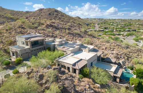 This incredibly unique property is like nothing you've ever seen. Built into its very own mountainside, guests will enjoy multiple levels of living areas and bedrooms, allowing extra privacy if desired. The location of this property truly sets it apart. On the mountainside, with its own small hiking trail! Wildlife is never far away! This 6,400sqft home sits on over an acre in the highly desired North Heights subdivision of Fountain Hills and nestled in the McDowell Mountains with the most amazing views of the Four Peaks, Red Mountain and as far as Superstition Mountains. ARIZONA SKY offers a large open floor plan, 5 bedrooms, 6 full bathrooms, 2 half bathrooms, a gourmet kitchen with Viking appliances and All-Clad cookware, multiple living and dining areas, a separate large game room, and a wet bar. It is perfect for entertaining guests, multiple families, or simply enjoying a private getaway.