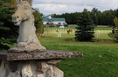 This equestrian estate has a very private setting with acres of lush landscape. White fences surround the grassy pastures. The water fountain dances on the private pond. Watch the beautiful sunrise over the cedars. Enjoy an afternoon of watching the horses, ponies, mini highlanders, mini horses, chickens and cows graze and play. See the deer and geese wandering in the pastures. Take in the colorful sunsets while sitting by your own private fire pit (wood provided).