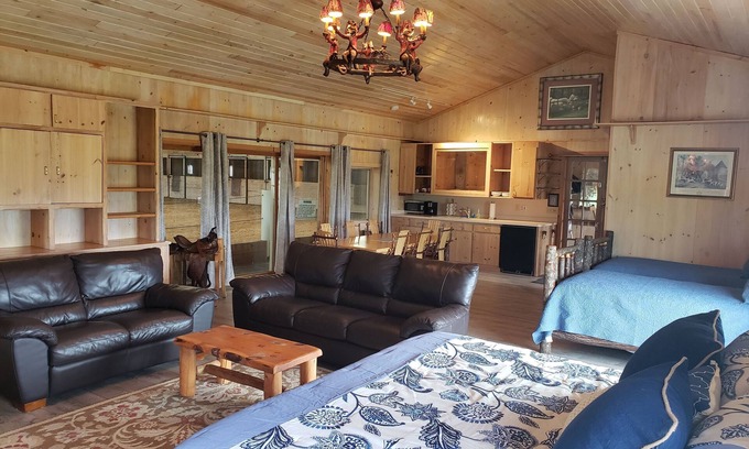 The beautifully furnished living quarters is a very large studio apartment. There is a new king size bed and 2 twin log beds. An Amish built table and dining chairs have views of the indoor arena. Kitchenette has an under-counter refrigerator, microwave, toaster, toaster oven, coffee pot, sink, dishes and utensils. All linens and towels provided. The private bathroom has a shower and new vanity with a stone countertop. There is a TV mounted over the electric fireplace and free high-speed wireless internet.