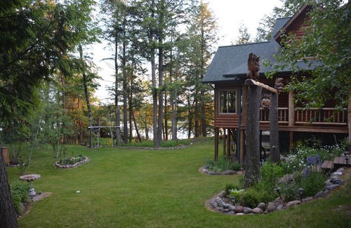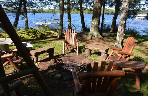 The yard only has a half dozen wide steps that get you down to the lake. There are two outdoor fire pits that make fires possible no matter the direction of the wind. A log swing and log chairs make for great family time sharing the days adventures around the fire. A small hill near the lake includes an open gazebo area surrounded by a flower garden with a table and chairs that make a great place to have breakfast or watch the sunset.