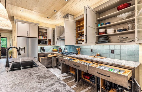 Set on 6 lush acres w waterfall pool, a small creek, and in a gated, safe, quiet neighborhood (with quiet hours enforced).. Alpenglow Falls was created to set a new standard for mountain luxury - View, water, fire, hike in/out, all en-suite bathrooms, king beds, open spaces, the sounds & smells of the 6 private acres of forest surrounding you and, unbelievably, just 1.2 miles to Buck's coffee from the neighborhood. Its privacy and location offer the best of natural surroundings while being close to groceries, restaurants and shopping!