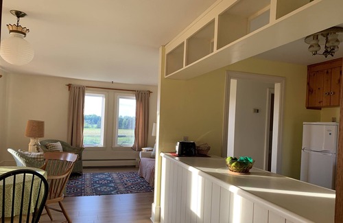 The Apartment is attached to the main farmhouse, but has its own entrance and is set farther back from the driveway and parking. We're set far off the road (Highway 215), on a working farm where we grow vegetables for a local farmers' market and raise animals. Along with the market garden, we also grow many flowers in our flowers beds around the house and over the property. Expect to see (and occasionally hear) cows, horses, chickens, and our dog during your stay (don't worry, you don't have to interact with her if you don't want to!).