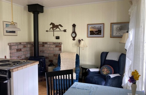 THE SITTING AREA - The sitting area can be considered an extension of the kitchen. Heat is provided by a gas powered heater in the style of a wood stove. Cuddle up in the easy chairs and prop your feet up on a foot stool. You'll be comfortable reading a book, visiting with the cook, or taking a cat nap. Or simply daydream while viewing the garden from the multi-pane window. A radio and CD player are provided if you'd like a little mood music. There is no TV service on the property. There is a DVD player and a selection of DVDs. Also high-speed internet service. If you forgot your vacation reading -- not to worry. The Cottage has a great collection of books including the history of Mendocino and surrounding areas. The Cottage is decorated with art by local folks in various media. Local and European photographs by John Uhlar, drawing by Chuck Hathaway, copper work by Mike Moreland, watercolor by Erin Deither, a Patty Walker print, weaving by Betty Lette, ... For the weather buff, there's a barometer and wind speed instrument.