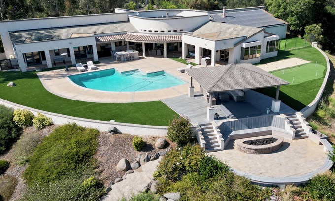 Discover unparalleled luxury at our private, gated 5-acre estate in San Diego. This resort-style private retreat boasts breathtaking 180 degree lake views, a large heated pool, hot tub, expansive fire pit, and a fully equipped outdoor kitchen. Inside, enjoy six bedrooms, 4K TVs in every room, a theatre room with 100-inch screen and surround sound, a full indoor and outdoor sound system, a state-of-the-art gym with peloton bike, infrared sauna, and a refreshing cold plunge. Ideal for weddings, corporate retreats, and multi-family getaways, or just relaxing in your own private oasis where you won't be bothered. Two electric vehicle chargers are available for an additional fee. Just minutes to Del Mar beaches and the San Diego Safari Park.