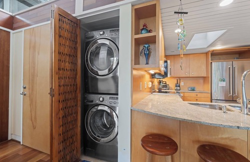 The Beach Bungalow has 900 square feet of living space with an open-concept floor plan, with spacious sitting and dining area, and wood burning fireplace. The great room is furnished with a leather 3-seated leather couch and classic teak furniture and teak dining table that can sit up to 8. The great room also has a murphy bed for guests. The oceanfront bedroom has a queen bed and a pocket door to separateit from the great room. The master bath was totally remodeled and features a freestanding heated tub with shoots, separate shower, and separate toilet room. An optional guest room can be rented during your stay for guests. It connects to the guest suite (photos are the end of all of the photos.). It has a Murphy bed, love seat, kitchenette and full bath with tub and has a separate entrance.