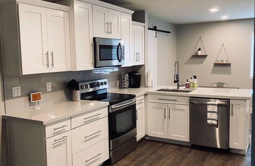 Attached Luxury Guest suite in Mesa Az. Private entrance and private living quarters with a full kitchen that is stocked with all the needed dish-ware and cookware. Private bathroom and bedroom with a King size bed. Located at the end of a cul-de-sac. In a quiet neighborhood 11 miles from sky harbor airport and Phoenix Zoo. Only 6 miles from Scottsdale nightlife. 2 miles from A’s Stadium, 6 miles from Cub's stadium and 8 miles from Giants stadium for spring training. 2 Vehicle parking spaces. This space was newly remodeled with brand new everything!! Sleeps 5 (1 king, 1 queen sofa and 1 folding rollaway bed). 2 big screen TVs with YouTube TV (ESPN and local channels), Netflix, Amazon prime And Disney+. Your own WiFi and a fully stocked kitchen with everything you need to make meals and feel like your home away from home!
