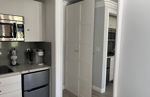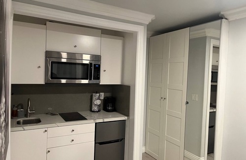 In the studio: Queen size bed (with allergy cover protector on mattress and pillows, memory foam mattress toper) study desk, mini kitchen (stovetop, microwave and small appliances). Tv, closet, private bath.