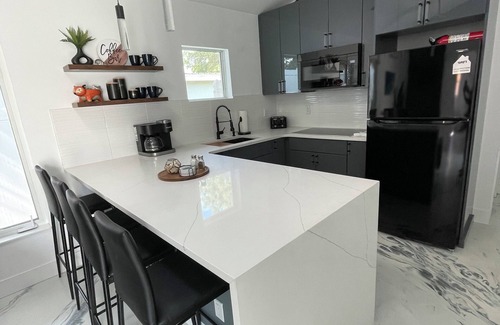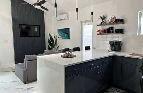 Have fun with the whole family at this brand new, modern private free standing guest house. Full bedroom with king size bed, with a finished loft including a queen bed. There’s also a queen pull out sofa in the living area. Enjoy your privately fenced backyard with a hot tub and putting green.