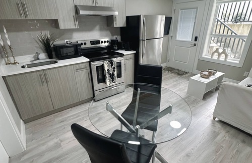Welcome to our new and modern private guest suite in Vancouver. This stylish accommodation features a fully equipped kitchen, stylish furnishings, and a smart TV. Enjoy the comfort of a cozy bedroom and the convenience of a central location. Experience a perfect blend of modernity and comfort during your stay.