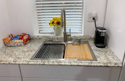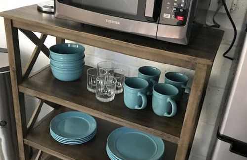 The space is spacious yet cozy - you will meet a Kitchenette fully stocked with pots/pans, a single burner stove, a microwave, a toaster oven, a header, and a fridge. Single bathroom with stand-up shop shower fully stocked for your use (Great towels as well, I wouldn't say I like cheap linens). The entire space is open with a comfy loveseat and a pretty comfortable bed, per guest reviews!