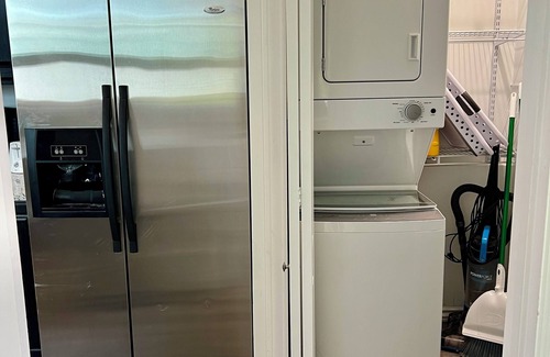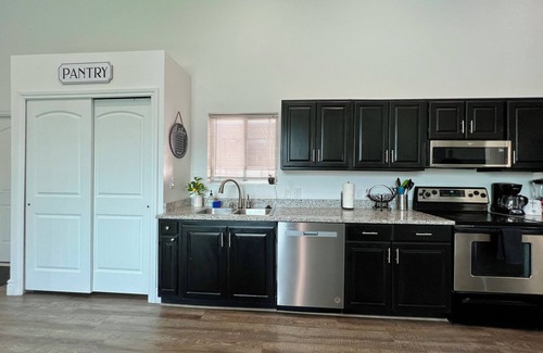 Enjoy this private guesthouse with a spacious, open layout, and modern finishes. Relax by the cozy fireplace, unwind on the reclining sectional, and sleep soundly in the king bed. Located near Jordan Landing in the heart of Salt Lake Valley, this stylish retreat offers comfort and convenience.