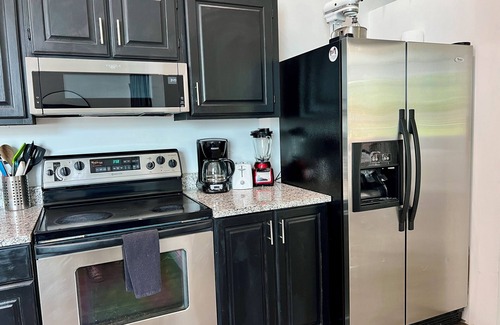 The kitchen is a chef’s dream, featuring granite countertops, black cabinets, and stainless steel appliances, including a full-size fridge, stove, and microwave.