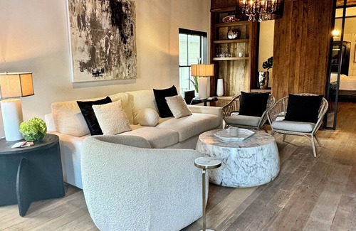 This historic house from the 1800s remodeled to modern decor with exposed brick walls, large glass and metal doors, original large wood beams line the ceiling. Beautifully designed for a charming and comfortable stay.