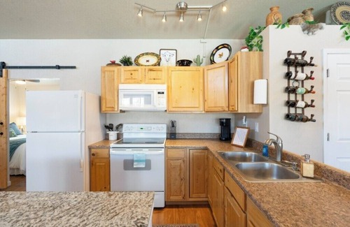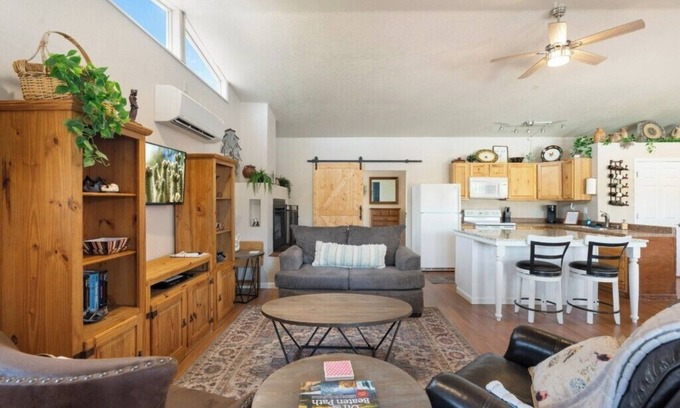 Inside, you’ll find a thoughtfully designed space with all-new furnishings and desert-inspired décor. The full kitchen is fully equipped with appliances, counter-height bar seating, and everything you need for dining in. Relax in the cozy living room with a plush sofa and 40" Smart HDTV, or step outside to enjoy the private patio and sparkling shared pool—perfect for a refreshing dip after a day of hiking or horseback riding.