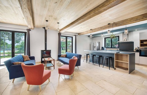 In the middle of a hectare of greenery, a large building of 300m2 has just been renovated for your comfort (Lou Papagai is a furnished tourist accommodation classified 4 stars and a gite 4 ears): 7 bedrooms and 5 bathrooms , Full WIFI, superb living room of 65m2 with fully equipped kitchen and its bar island, a large table with 16 seats, In winter, a wood stove will be the focal point of the lounge area.