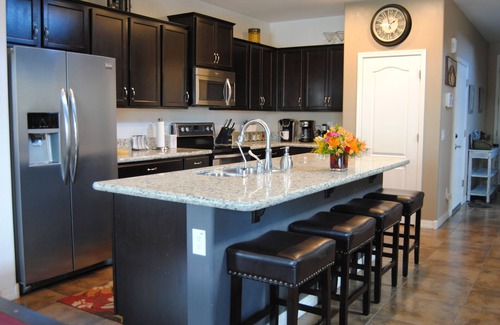 Kitchen and Bar: Inside, you'll discover a stunning and spacious open layout designed to make hosting a breeze. The expansive, well-equipped kitchen stands out with its granite countertops, sleek stainless-steel appliances, and a substantial center island. The double oven makes it easy to feed a crowd. Our Western-inspired bar area comes complete with a comprehensive assortment of barware, complemented by a 60” TV positioned above the bar, all set beneath high ceilings that enhance the sense of openness. Ample eat-in seating is available, accommodating up to 12 people comfortably, with seating available at the island and on both sides of the bar.