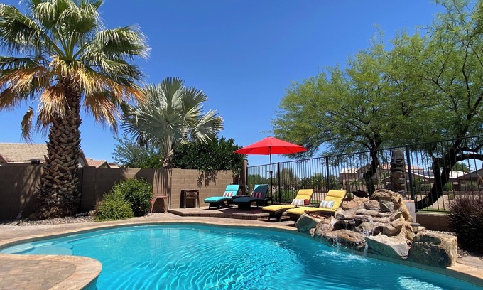 **Oasis in the Desert!** Beautiful Johnson Ranch, large 2-Story, vacation-ready home featuring a heated pool with a tropical waterfall.